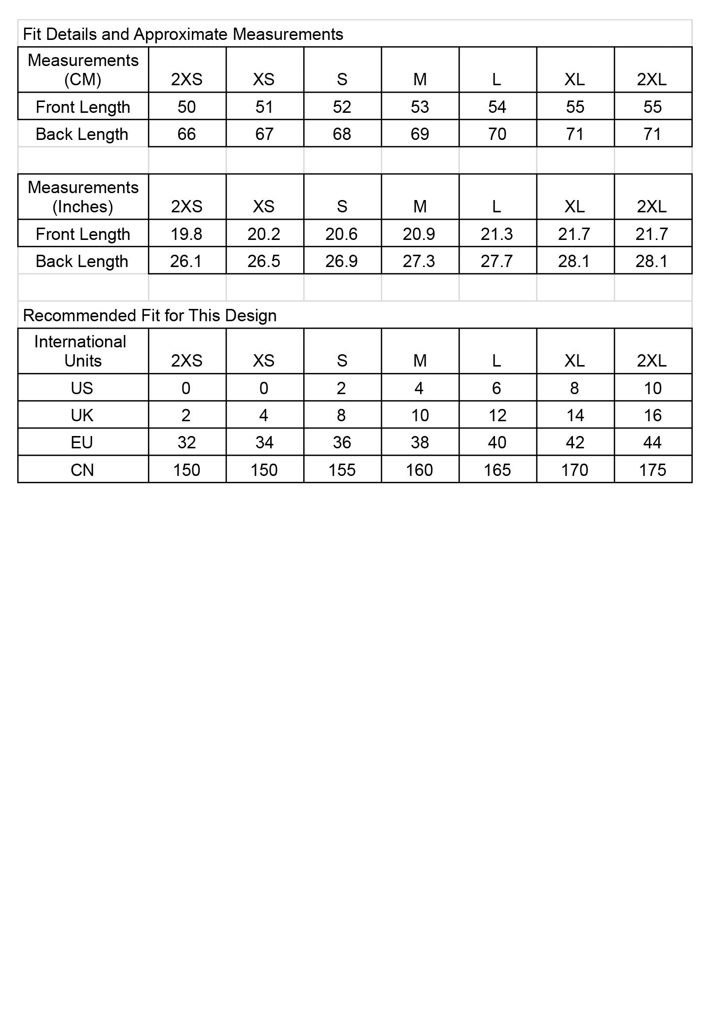 Size chart as shown in last photo